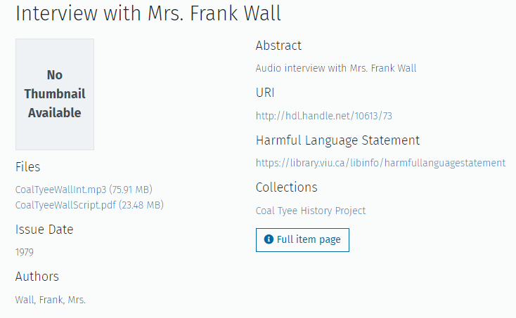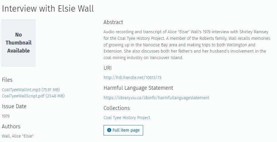 I work as the Digital Collections Assistant at the Vancouver Island University Library, and as a summer project, I was doing some reparative description work on one of the library’s electronic collections โ the Coal Tyee History Project. This collection is made up of audio recordings and transcripts of interviews with Vancouver Island coal miners and their family members and is hosted online in VIU’s open access institutional repository, VIUSpace. The interviews were conducted between 1979 and 1984 by the Coal Tyee Society, and most interviewees were from the coal-mining communities of Nanaimo and Cumberland. Transcripts in the collection were primarily created by the society, with just a few missing ones completed afterwards by the VIU Library Technical Services Department.