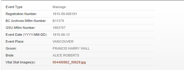 It took one attempt using the BC Archives Genealogy search tool to find Francis Wall and Alice Roberts’s marriage record from 1915.